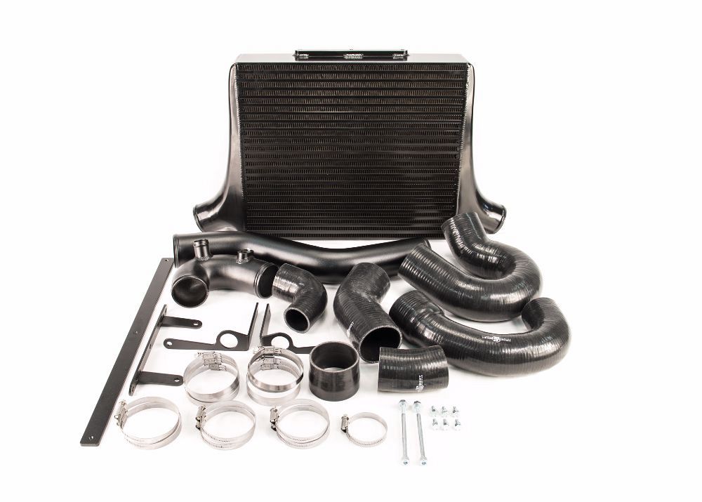 Kit includes 2.5in hot side intercooler piping, and 3in cold side intercooler piping with a new 3in high flow cast elbow at the throttle body.